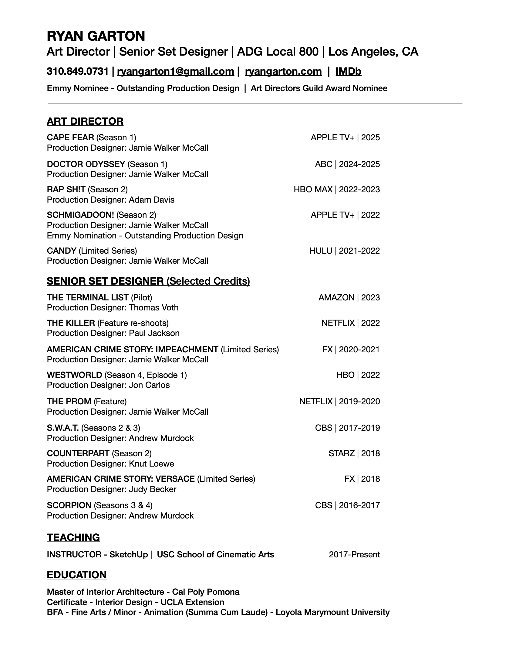 Ryan Garton is an Art Director and Set Designer working in film and episodic television. A full résumé of credits and experience can be downloaded below. Download Resume (PDF) IMDb